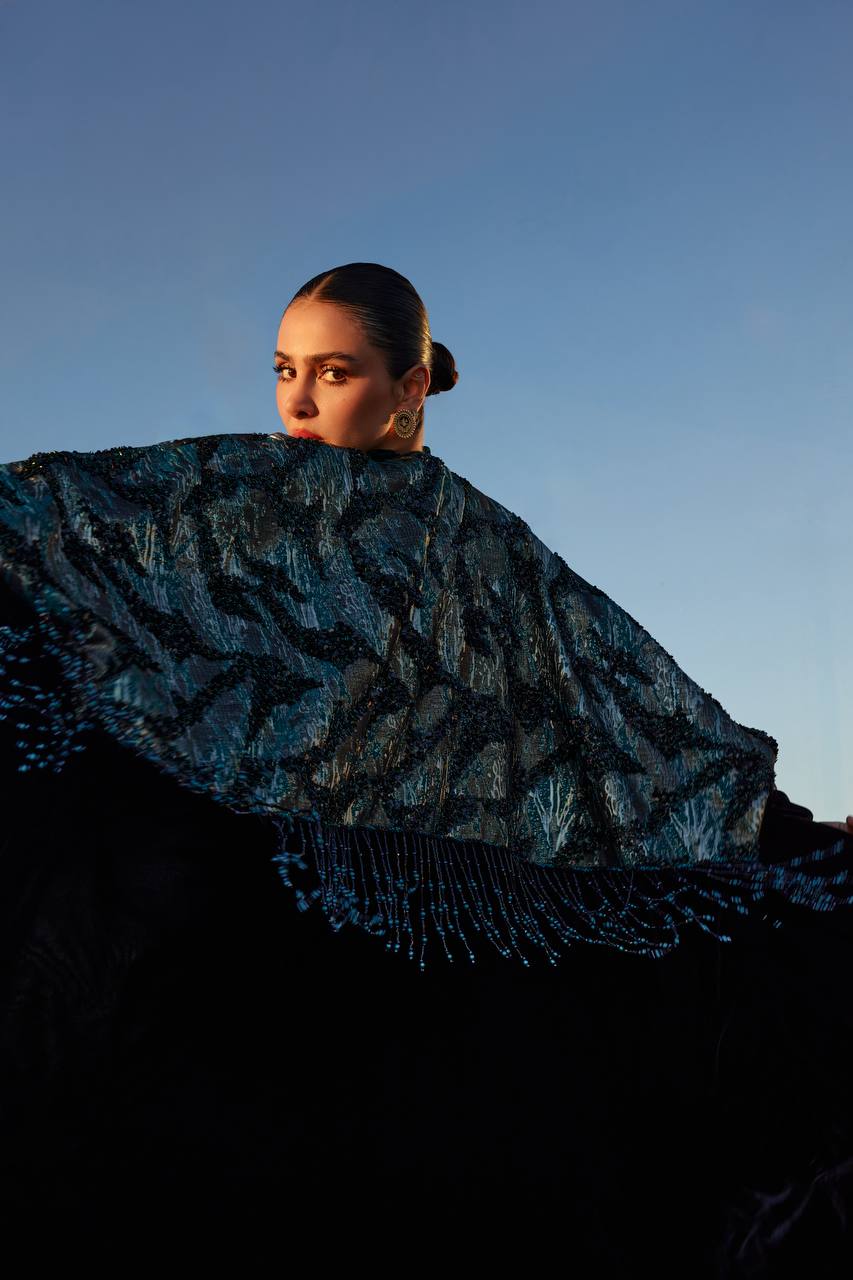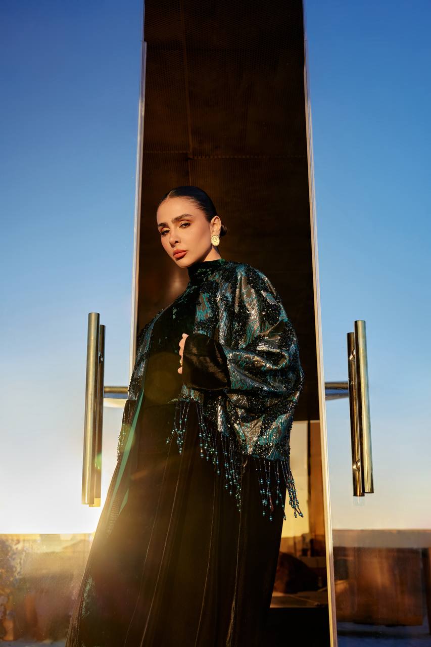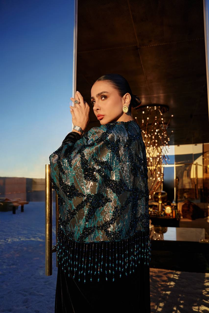Stand out with an elegant look featuring a uniquely designed bisht in turquoise velvet jacquard fabric, adding a touch of luxury and distinction, paired with a matching turquoise dress. Adorned with exquisite hand-beaded details, this set offers a sophisticated look that combines luxury and refinement. (Price is for the bisht and dress)
