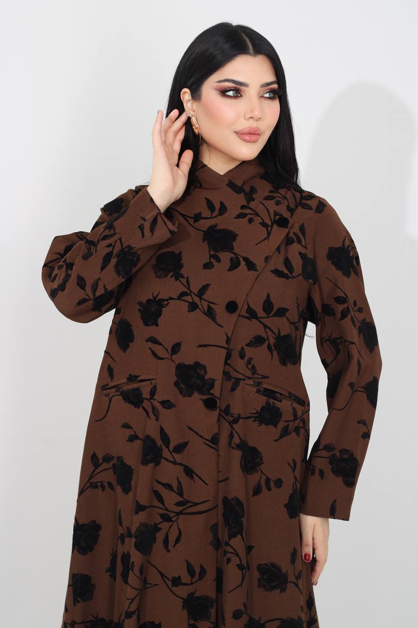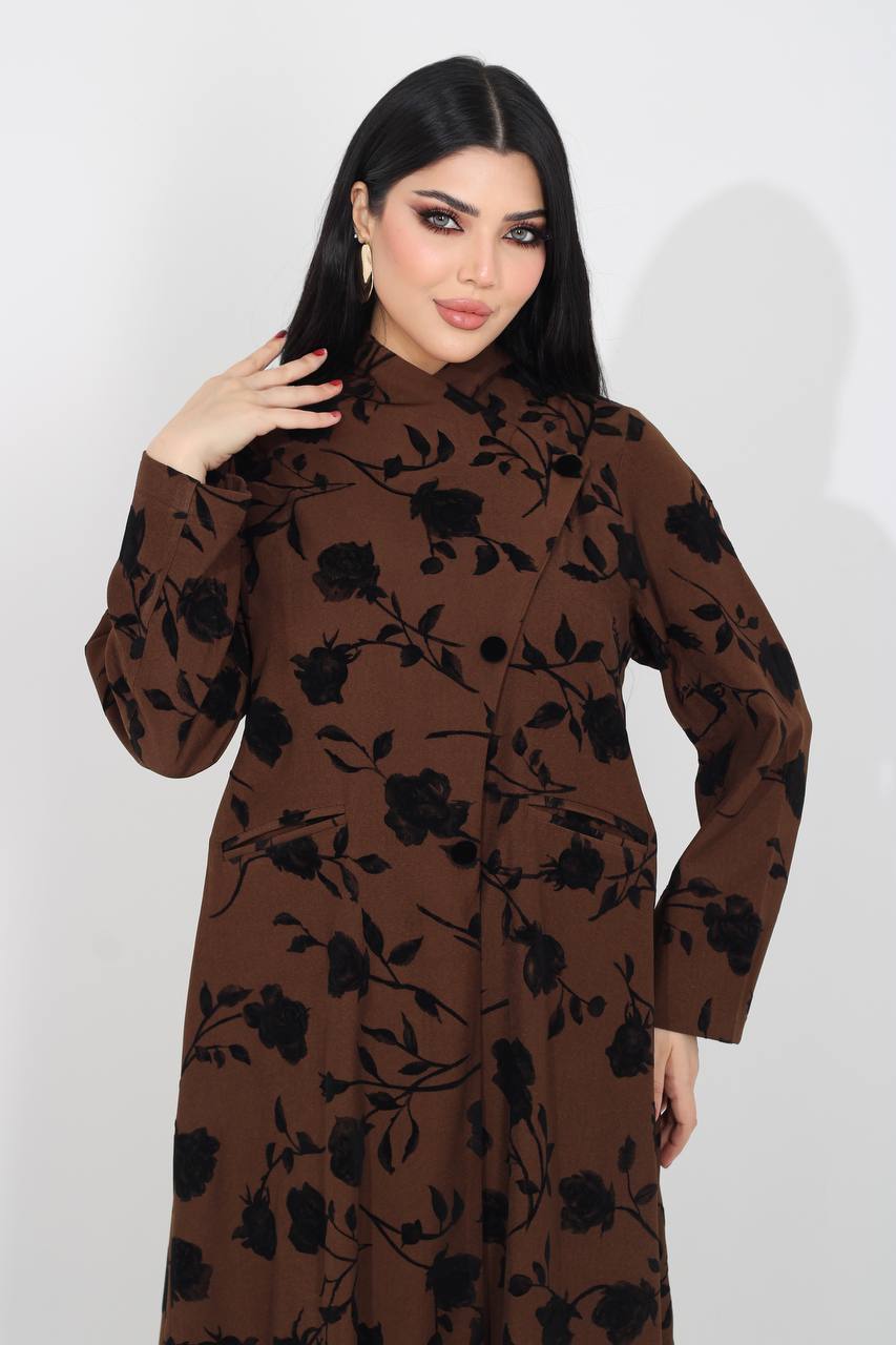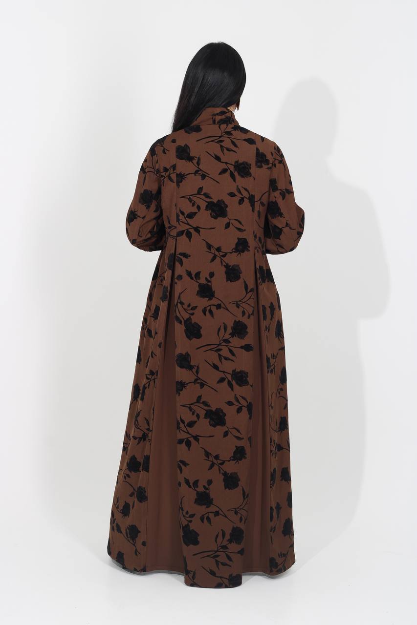 عباية كريب باللون البني مطبوعة بتفاصيل ورود مخملية . C:IB370