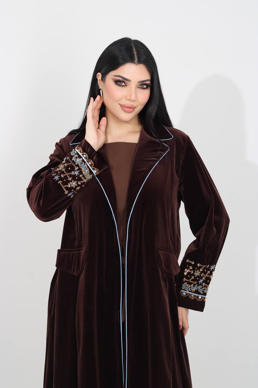 عباية بليزر مخمل باللون البني مع شك يدوي . C:IB369