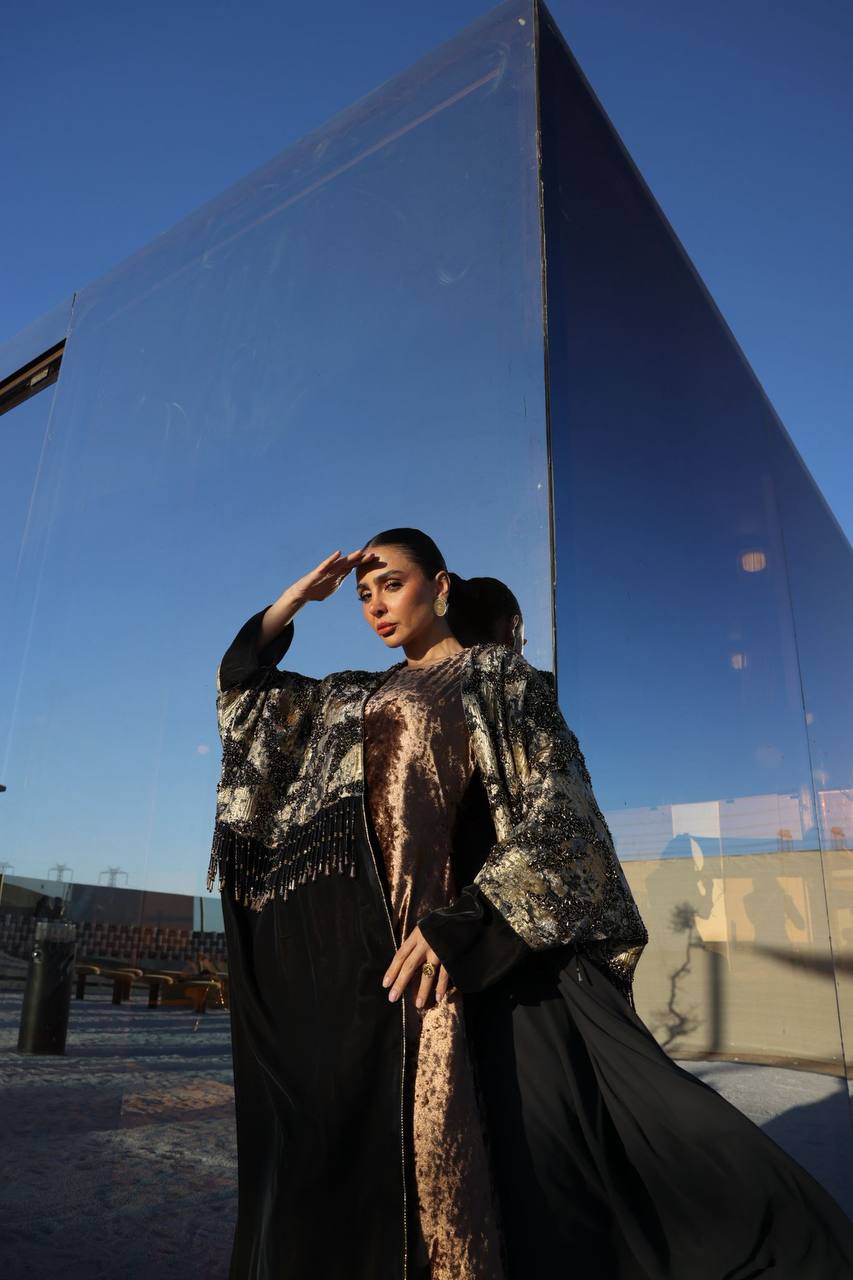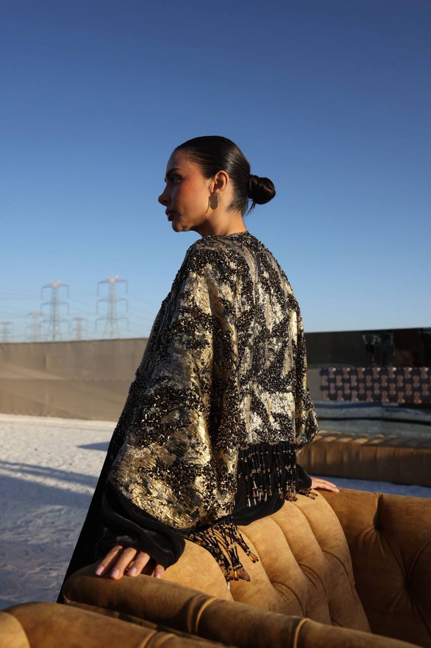 A bisht with a dress, made of jacquard and velvet with hand-stitched details.C:373